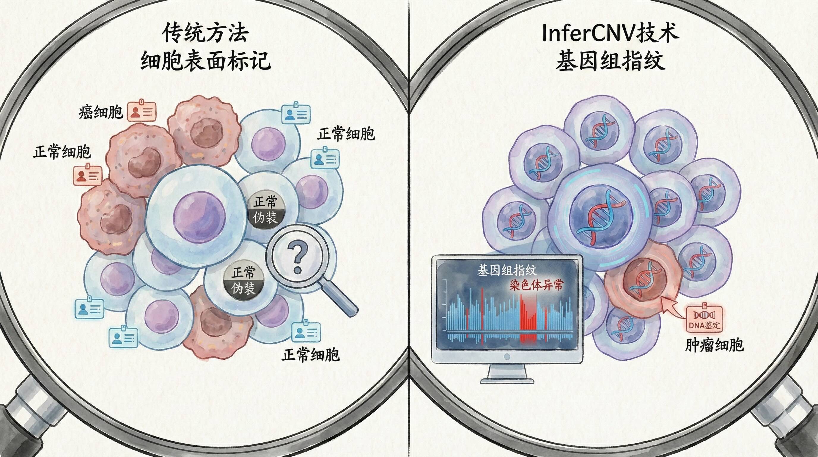 一项名为InferCNV的计算生物学技术登场了。它不看细胞的"外表",而是直接检查细胞的"基因组指纹"——就像警察通过DNA鉴定罪犯一样。这项技术能从单细胞测序数据中揪出那些携带染色体异常的肿瘤细胞,准确率令人惊叹。