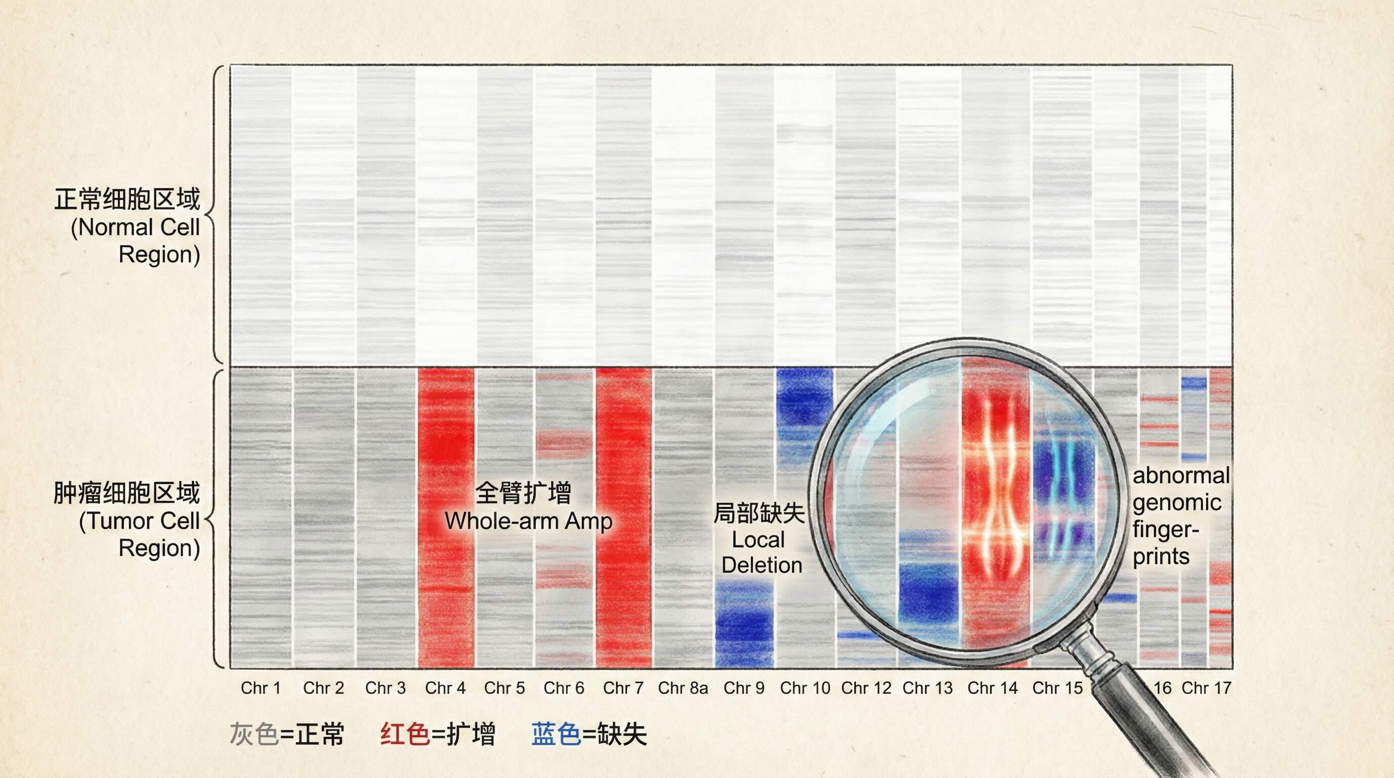 这种视觉上的对比一目了然,就像在混乱的人群中,那些携带"异常基因组指纹"的肿瘤细胞立刻暴露了身份。