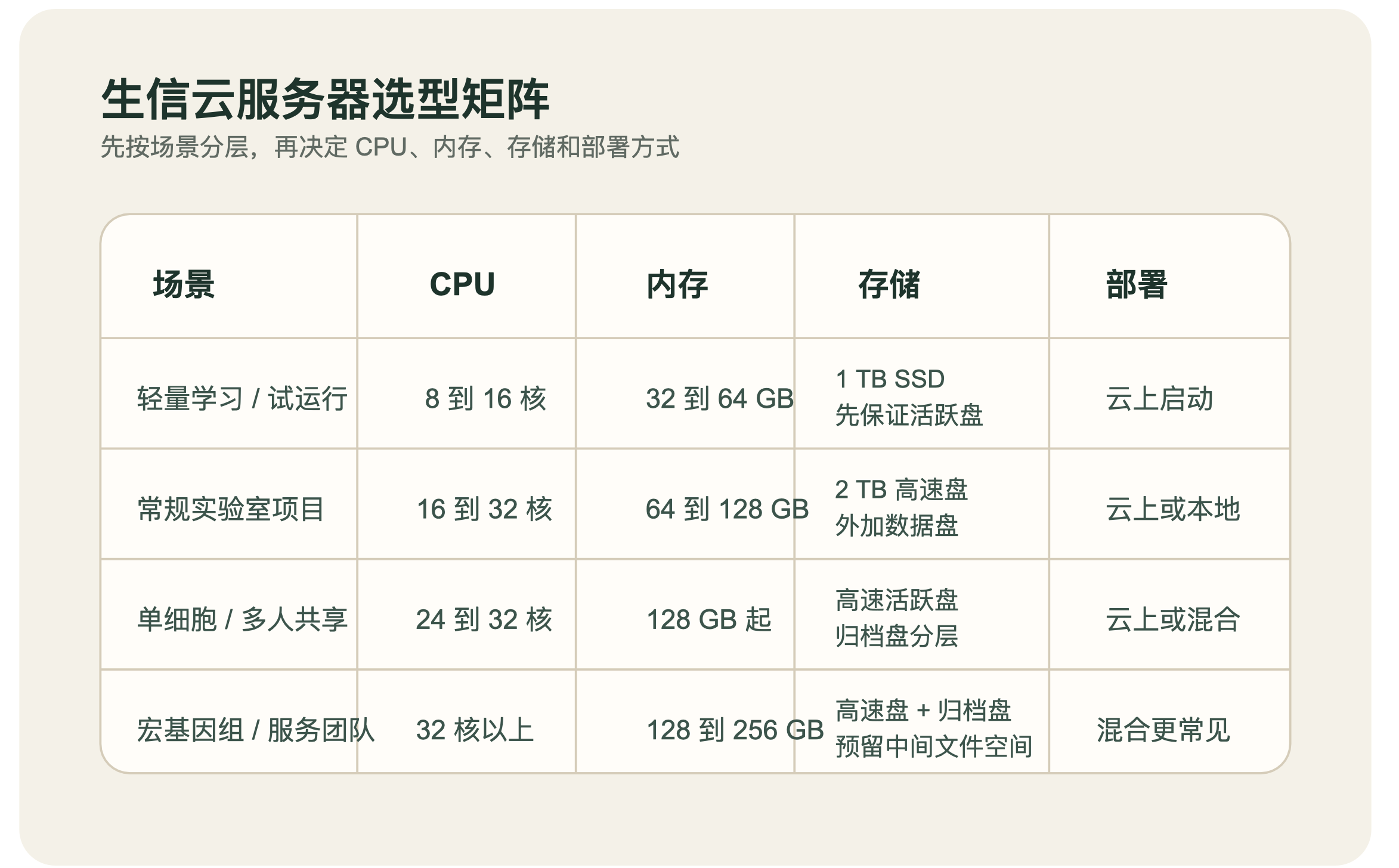 生信云服务器怎么选,归根到底不是选一台机器,而是选一套能支撑项目推进、团队协作和后续扩展的资源方案。对多数真实团队来说,最有价值的不是追求纸面最强配置,而是把分析场景、数据规模、并发人数和数据留存方式先理清楚,再去匹配 CPU、内存、存储和部署方式