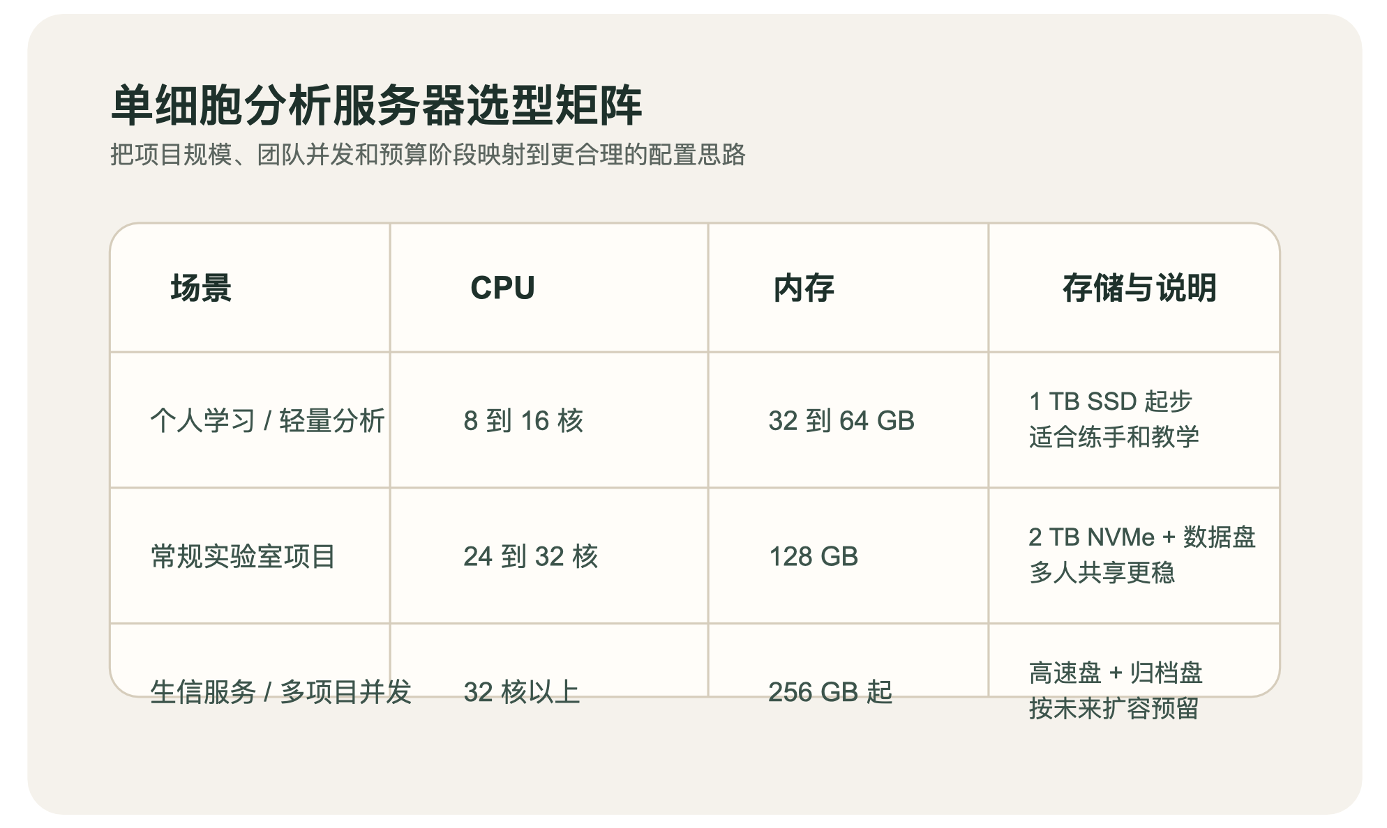 所以,单细胞分析服务器配置不能只盯 CPU。对多数团队来说,内存往往才是第一个真正撞上的瓶颈。