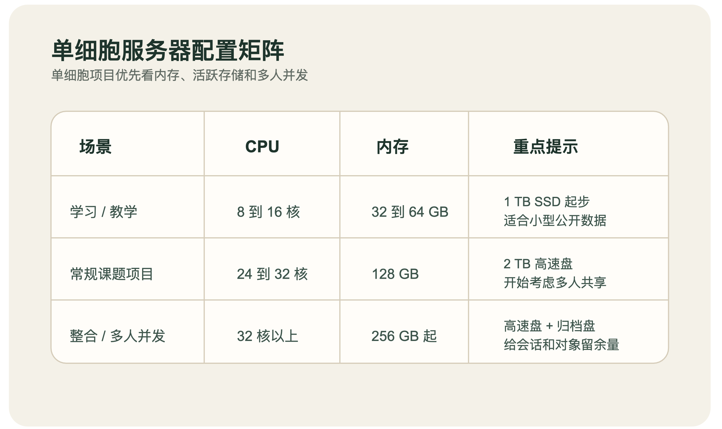 单细胞服务器配置怎么选,说到底不是“买一台大机器”这么简单,而是要把分析起点、对象规模、并发人数和数据管理方式一起看。对大多数真实项目来说,最稳妥的思路不是盲目追求最高参数,而是优先保住内存、活跃存储和合理的并发余量。